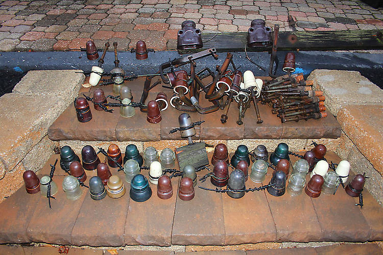 2 Westinghouse Buddha cutouts, 12 brown Ohio Brass U-118s, 11 brown Illinois U-138s, 6 white Illinois U-138s, 3 no name U-281As, 4 Porters (could have had dozens,) 1 No name brown U-138, 2 No name brown U-114s, 1 white Ohio Brass U-118, 1 No name Sim U-149, 1 No name U-153, 1 MP U-152, 2 GP U-152s, 2 Hemingray 40s, 1 Hemingray 40 Patent 1893, 1 Hemingray 42 aqua, 1 Brookfield CD 152, 8 Hemingray 17s, 5 J brackets |