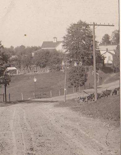 A line of ten-pin crossarm telephone open-wire poles followed along this winding, unpaved roadway....