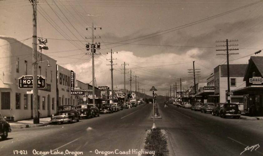 Electric sub-transmission lines strung beneath their crossarms on suspension insulators....with local power distribution circuits (beneath) ....ran along this downtown's street (the Oregon Coast Highway) along with a really neat 4-crossarm telephone open wire line along the right. Along with the old cars, vintage store signs and other yesteryear street furniture, this is a superb example of Americana, USA in my opinion ;-) |
