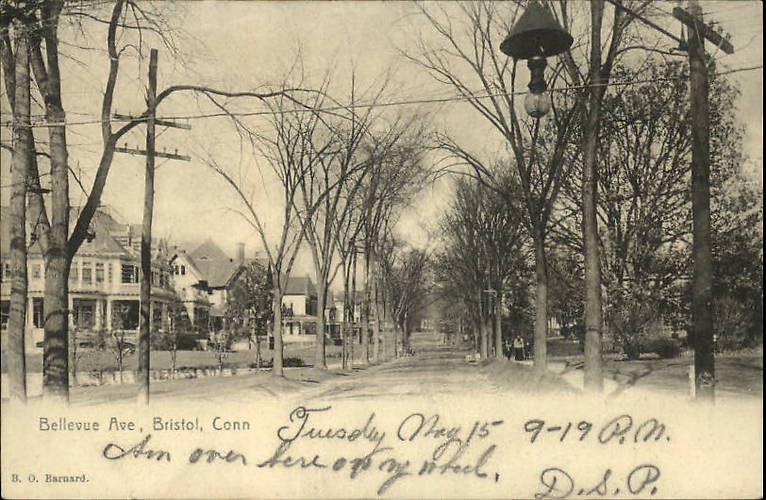 The enclosed-type arc light shown is of a then-newer type and these became commonmplace starting in the late 1890s. It was more energy efficient and required less maintenance than the open-type arc fixture that likely was once here. Those had a cone-shaped metal shroud above them for weather protection. In some upgraded installations such as this one, this "protector" was retained. |