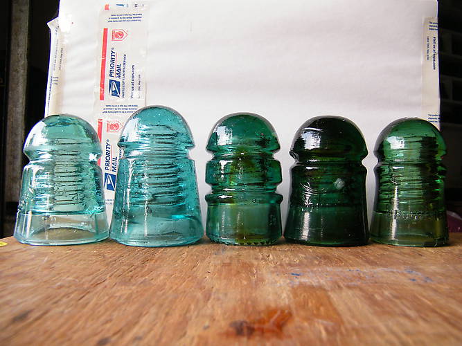 Moving from left to right, the far left is yet another NEW ENG TEL CD 104 in a different shape then all the rest I have. This is the only insulator here that didn't come from that mystery collection. All the rest did. Next to the New Eng Tel tha is a Pennyquick 104 that is nice and fizzy with a milk swirl on the lower deformed threads. This is a first for me in all the time I have been hunting down the gems of our hobby. In the middle is CD 114 B with some awesome amber an SDP's. It's nieghbor to the right is a Brookfield 102 pony that also has some great amber swirling and a nice white stone right of front over the embossing. That jumps right out at you being so close to the surface. The last is another Brookfield blobtop or tall version in a light green/yellow green with a wide amber streak coming right down the center in the front. |