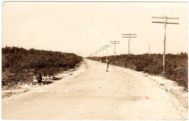 It appears that the gent in the middle of this road is having a good look at one of the open wire telephone poles that lined this road.