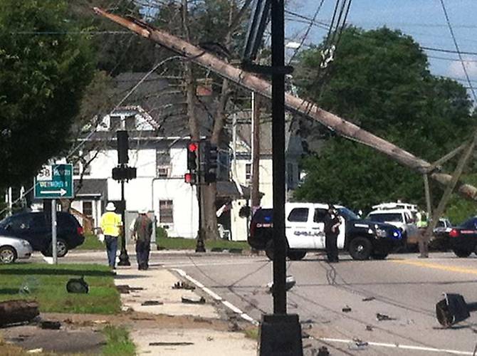 This beefy cresoted 55-foot pole was installed around 1960 and had six angle-mounted Lapp line posts in brown mounted upon it. They secured 477 alunimum cable at 13.8 kv. A car hit it HARD today and the pole fell as shown, with 13.8 kv primaries falling upon a 4kv line in the background at the intersection you see. Nevertheless there was quite an outage here in Abington, MA on this hot humid day! The entire town centre was blocked off owing to wires all over the place. Since I have been an electric utility employee for a long time, I was granted access to the secured area. And best of all, the supervisor in charge of operations said I could take any junk laying around... So I did! I now proudly have six Lapp four-tier brown line posts from this fallen pole. Each has the LAPP underglaze marking with their L-within-I logo (within an oblong oval) signature. Included are their heavy-steel angle pin crossarm mounts. I know all of this stuff isn't worth much on our collectors' market. But it's memory-lane stuff to me with a sudden-impact, unexpected find.... I will show my loot here within the next day or two. I've always remembered this pole ever-since-who-knows-when and I have looked up at this pole at least a million times. It never was anything really special, but now it is (or was). Owing to this unfortunate accident I now own some of the stuff atop it along with all four of the weathered wood crossarm braces too...which will find respectful places within my outdoor museum ;-) Please refer to [id=378524042] for another view. PS... Ironically, the traffic lights remained in service in the background because there was a totally different circuit that served them, terminating just to the left. |