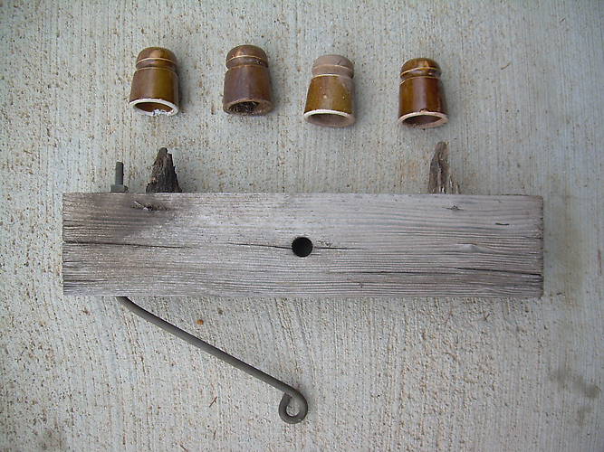 I went out again today to track more of this phone line and found another very unique cross arm, Once the pins are replaced it will be in good shape. I have never seen a cross arm brace like the one's used on this line. I also recovered four more of the porcelain ponies that were used on this line. |