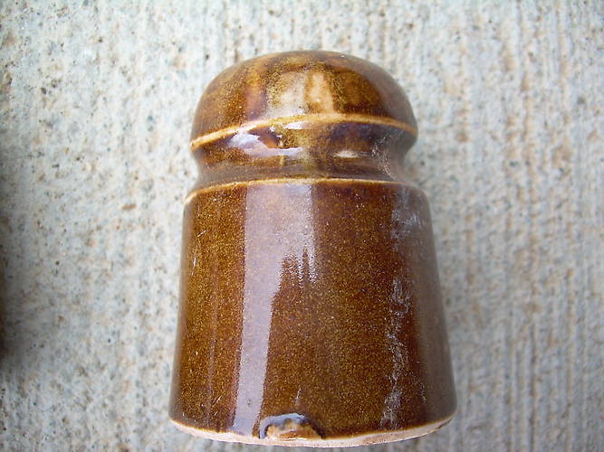 This is a close up of one porcelain insulators, The glaze on all of them is multi colored and runny.