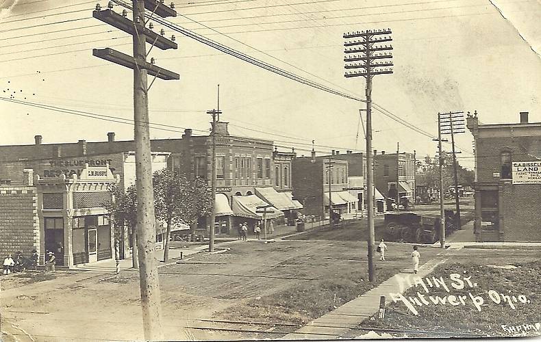 Some if not all of the insulators on this early 6-pin telegraph pole crossarm appear to be CD 145 "beehives" or "signal" style insulators. Note that these crossarms were held in place via two lag screws (most likely) or through-bolts. This line pararelled along a railroad line that ran through this community. Also is a tall telephone openwire line seen crossing above with ten-pin crossarms with paired cable beneath. Chances are that this was a subscriber lead, serving the residents of this Ohio community. |
