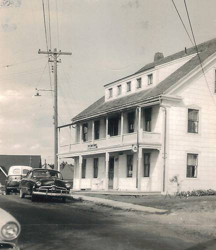 This was very typical Central Maine Power Company pole line construction for many years. In fact a lot of this kind of CMP architecture lasted well into the 1990s when higher primary voltage conversions took place. Commencing soon after their debut around 1928, the utility started to use LOTS of three-skirted Lapp pintype (line-post design) insulators, all in shades of mahogany. The company also retained a lot of their incandescent street lights like this one through the 90s, too. In fact some historic Maine communities such as Kennebunkport still have incandescent street lighting because they adore their vintage appearance by day or night...and town residents are willing to foot the bill to keep them alive and well. Proudly sitting in front of this beachfront motel is what looks like a 1949 or 1950 Ford. Being a MoPar guy I cannot tell the difference, lol. |