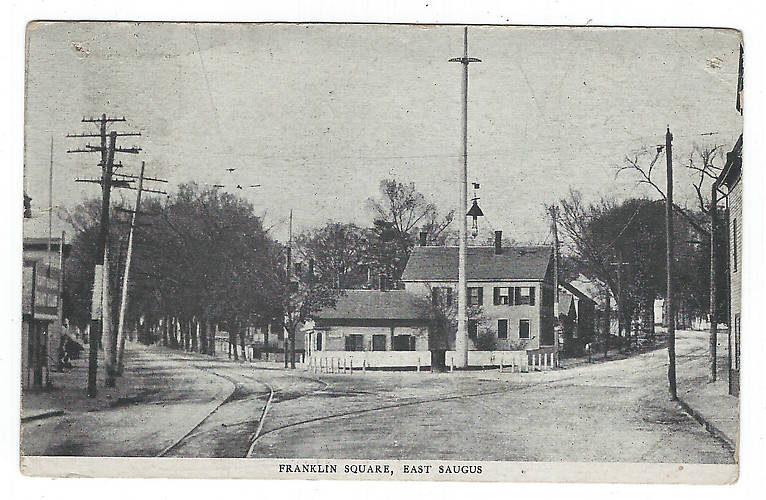 Downtown view of this community's business centre. This actually was an image taken in East Saugus (part of the same city)...about 10 miles north of Boston, MA. A very early (1890s) open-type arc light is seen here that illuminated this square. On the left are a mix of telephone and electric lighting service poles and wires. One can only imagine what kinds of rare Boston-area manufactured glass insulators are within view here ;-) |