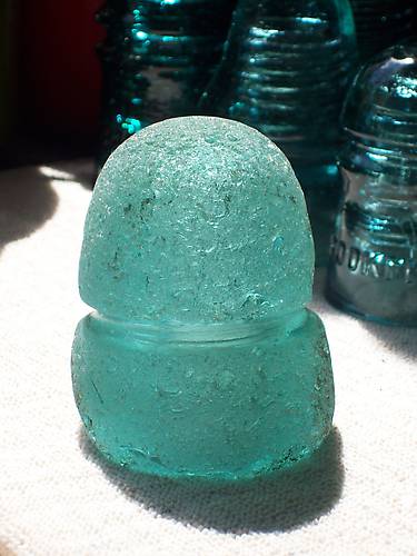 Someone posted a link to a small piece of a "sea glass" insulator a couple of days ago on the ICON email digest. Mine's a little more intact. I'm not absolutely sure that this should be classified as "sea" glass, though, because judging by the damage, it looks like it's been tumbled around a rocky river bed. See other side [id=380040185] and base [id=380040309]. Sea glass or river bed, I thought it was cool, and figured it was worth the buck the guy at the flea market was asking for it. 8^D |
