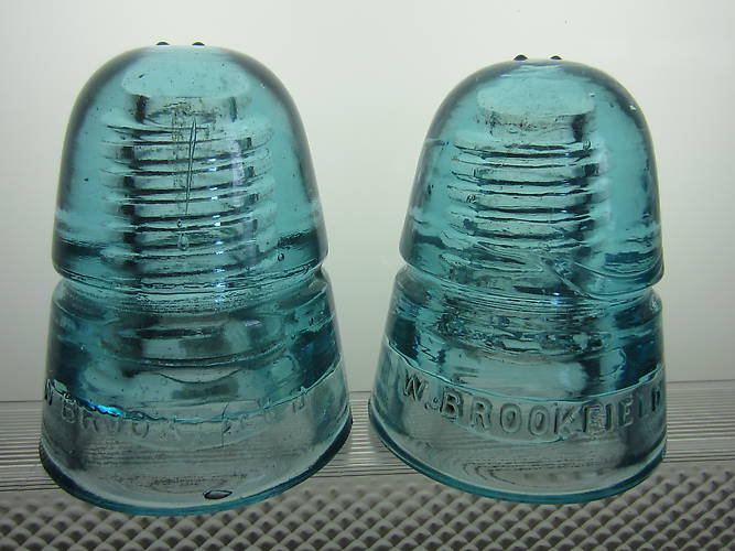 CD 145 W. BROOKFIELD // NEW YORK in Aqua. Similar to EIN [270] but with 2 glass dots on dome. The one on the left is regular embossing. The one on the right has a bold embossing. Neither is in the present Price Guide.