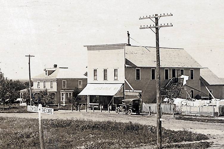 A railroad crossing likely was the vantage point from where this image was taken, given the "Lookout For Cars" sign seen on the left.