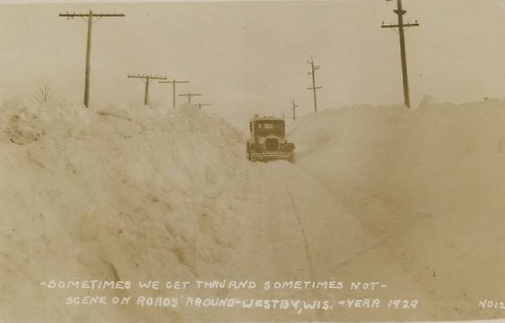 A telephone openwire line is along the left with a vehicle struggling (!) to make its way through a high-piled snow path with an electric power transmission line of the "wishbone" bracket single-circuit design on the right. The latter were heavy duty galvanized-steel brackets mounted on wood poles designed to last for centuries. |