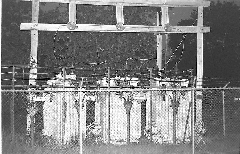 A flash picture of the 23kv sub that powered the refrigeration plant of the Eastport, NY.,Long Island Duck farm taken back in the 1960s.Notice the Pyrex insulators.