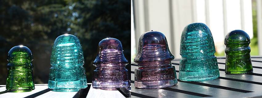 These three were amongst dozens that were in a barn that belonged to a phone lineman that had passed on some time ago. His relatives were selling the collection...these three were ones that I purchased. The others were common or in rough condition. A pretty plum California signal, a very bubbly unembossed 145 pennycuick and a sharp looking 7-up or emerald green Canadian pony. From the barn to the display shelf...neat. Couldn't decide if I liked the picture with the sun in front or back...so showing both views. |