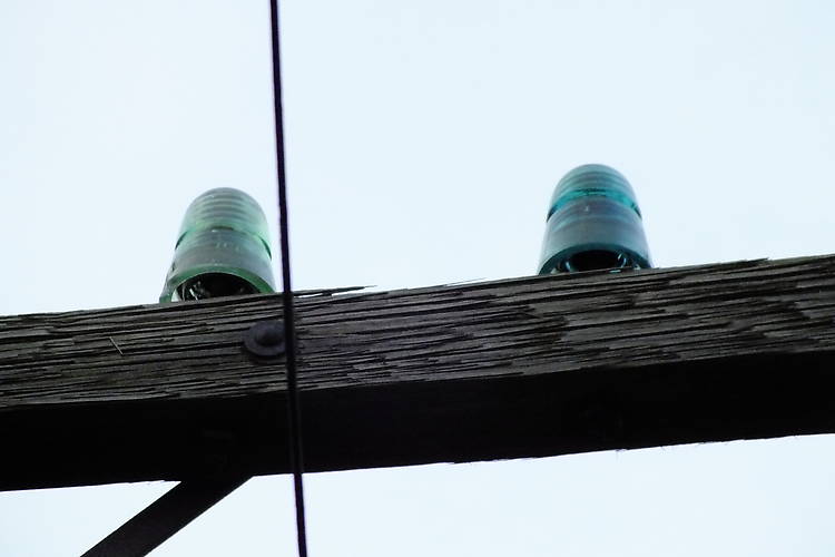 Here is the other lime green H.G/Petticoat hive I found while looking over this new sight. I am pretty certain this is an H but it could be an A, From what I could see it looked like a H. Their are numerous other Petticoat hives on this line but the catch is that these insulators sit 25 feet up in the air on un level weed infested ground along the old C&O Toledo/Columbus main just south of Fostoria Ohio. Any ideas on how to get these down?? |