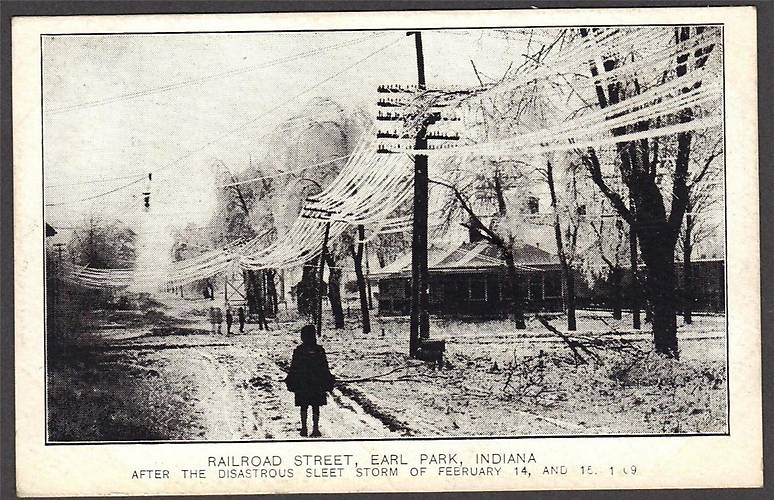 Also seen is an arc light that illuminated the intersection in the background. It looks like these lines and their crossarms/poles were rather well built and pretty sturdy to withstand the hefty, added weight of the ice that was thickly-caked around each of the wires we see here. |
