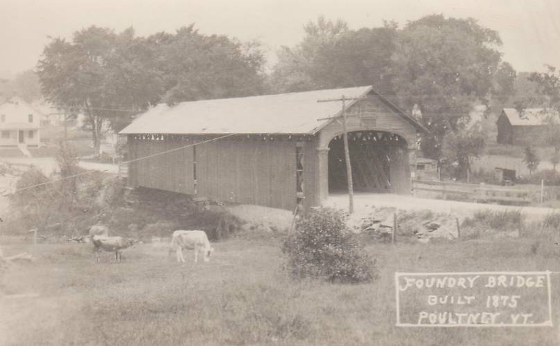 "Foundry Bridge" built in 1875 in this quaint Vermont village is seen here with a 10-pin, 2-crossarm telephone line also crossing the river next to this historical structure....