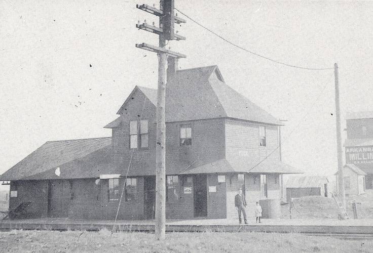 Seen in the foreground is a wooden junction box for connecting open wire circuits to bundled paired-cable that led directly to the telegrapher's office within the railroad station you see here. This construction practice was commonplace for many years among telegraph companies. I believe this photo was taken along one of the Rock Island Railroad routes. |