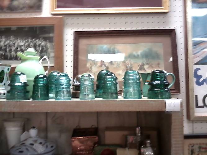 CD 162 Lynchburg in dark aqua, $8 (went home with me). CD 102 Brookfield in teal aqua with SDP $8. CD 106 blue Lynchburg, $8 (went home with me). CD 102 aqua Brookfield $8. CD 106 Hemingray [250] in dark aqua, or some kind of light green, (needs cleaning to be sure) $6.50 (went home with me also). CD 121 Am Tel & Tel Co. $8. CD 162.1 Brookfield in teal aqua $8. CD 147, CD 145 B beehive, CD 115 Hemingray and a porcelain signal in the back row. Found here in Ruckersville in one of the antique malls. Wonder why Michael and Jackson missed them? |