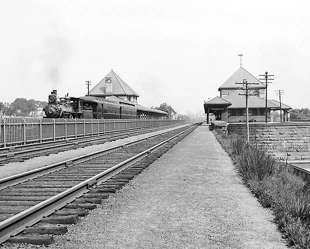 This line was totally revamped from iron wire to hard-drawn copper around 1910. New (cedar) poles were also set and the added insulators were light aqua and greenish CD 145 "B" beehives mounted upon 10-pin crossarms. This sort of conversion seemed to be the rage elsewhere here in the Northeast with Western Union around that time since these new lines and provided much better service and improved reliability. The line you see was built around 1890 and probably used crown-embossed Brookfield CD 145s. The latter and some of the hardware such as braces were recycled if in good condition upon the "new" line. In 1967 all of the forementioned c.1910 construction was removed by Western Union leaving only (much later-installed) signal circuits below. The line crews simply tossed the old crossarms into the brush...with insulators intact. Pursuing this long route soon after its dismantling (I lived in Brockton then) as a kid really was an incredible thrill even though I was lugging home lots of smoke-encrusted...now-considered common insulators heavily packed on my bicycle's rear "paperboy-style" wire-mesh baskets. That sure was fun. Added note: The granite block building on the right still stands and currently is the headquarters of the Brockton Police Department. The station on the left was razed long ago, perhaps in the 1950's. ----------------------------------------- |