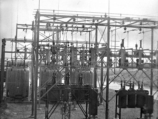 Substation off Pulaski Rd. in Huntington, NY handled just these voltages back in 1961 when this picture was taken. Now it has 138kv coming in, stepping down to both 69kv and 13kv, with the 69kv stepping down to 23kv since 23kv is still used. All of the equipment shown here has been taken out by the 1980s. |