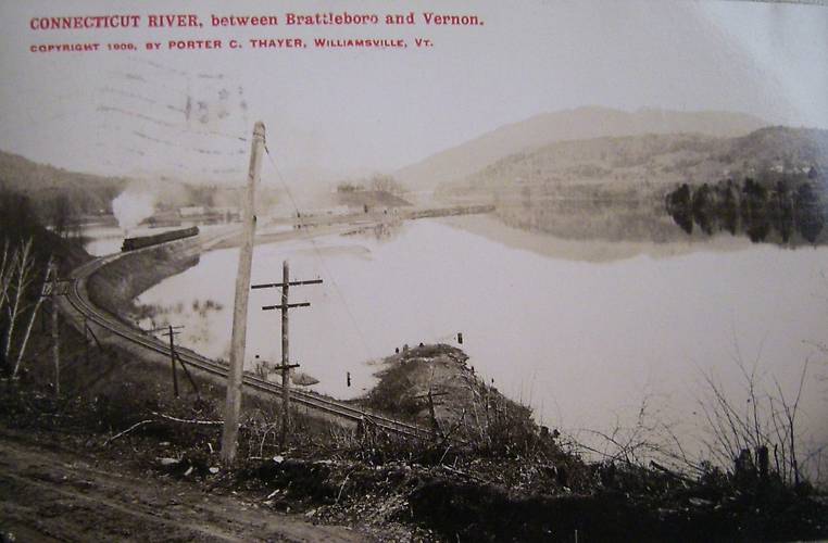Nice scenic view overlooking the Connecticut River and the tracks in the background. Helpful note...Any of you folks scouting around in this New Hampshire vicinity for insulators might want to make note as to how these and area telegraph lines stood and the basic method of their architecture, spacing, etc. This pictoral info as well as our images within our other vintage scenes on ICON can be very valuble to insulator-prospectors in detecting what-stood-where and when. |