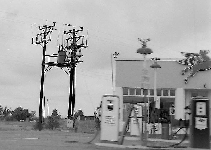 This picture was taken in Yarbro, Arkansas in 1964 showing metering transformers for both 33kv and either 4kv or 12.5kv next to a gas station.