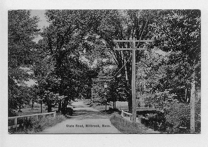 Roadway photograph in the Millbrook section of the forementioned historic town that became MA State Route 3 in later years leading to Cape Cod about 15-20 miles further southward along this stretch. This open wire phone line is believed to have been owned by New England Telephone and Telegraph Co. (NET&T Co.) when this image was taken. |