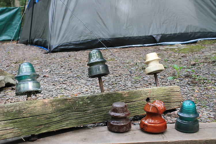 Here is a cross arm I had to cut just to retrieve this nice CD 162 Star in nice yellow green. I could not break free the insulator from its pin due to age and rust. Both pin and insulator would turn as I tried to twist off. So It was a good thing I brought my fold up saw on my camping trip. I carefully sawed through the cross arm and brought this section back to camp. |