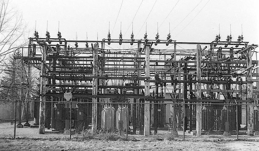 Installed in 1951, but much older looking. This 34.5kv to 4kv delta Cleveland Electric Illuminating sub may have replaced a municipal power plant supplying this town. Now taken down as 13kv Y connected lines have eliminated the old 4kv. Picture taken 1970. |