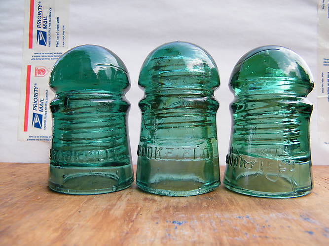 These three different colored Brookie ponies and insulators in my next couple pics were found while spending about one and one half hours at the Stormville, NY flea market. Before searching through the boxes they were in I told the vendor to stop anyone who may be shopping over my shoulder while I was looking. He didn't believe that would happen but sure enough it did. Was asked by some guy what they were worth. He wanted to know because he said where he lives there are many he could grab if it would be worthwhile for him. The vendor helper told the vendor I was taking all the best insulators. In my own mind I asked him what he expected and actually told hm he was correct in his assumption. His remark had no effect on the price however. I've purchased a good many from the same vendor over the last few years and kept telling him to bring any he may have when he shows up with nill. |