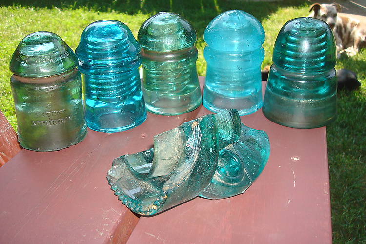 Stopped at two flea markets in Northern Minnesota in August and found these: The left one is a CD 126.4 W.U. W.E. MFG. CO patent applied for, followed by a CD 125 PAT APP FOR looks like Brooke's Blue. The next two are Brookfield CD 126's and then a H.G.CO. CD 145 bee hive blotted out embossing. Then there is the one half of a Columbia CD 263 with sharp drip points. Our dog Maddie is in the background. |