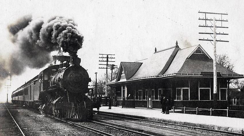 A coal steam engine bustles past this Illinois railroad station...with a lot of dirty smoke coming from it, too!