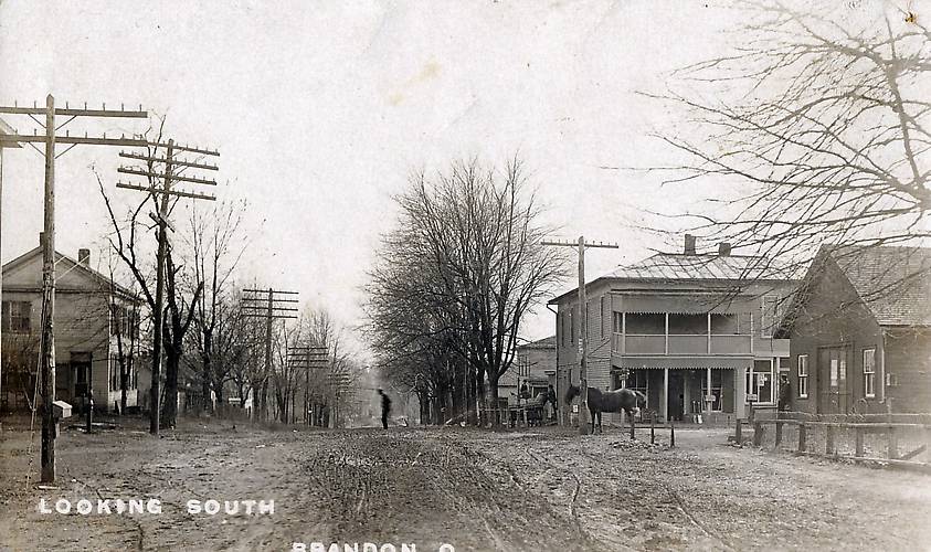 Phone circuits are seen extending along each side of this small Ohio village's centre's unpaved roadway...