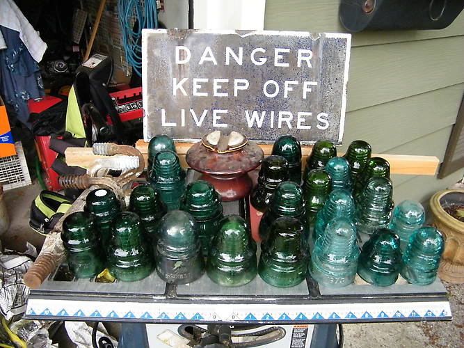 Almost didn't walk into the tent where I found this porcellain sign. Last time the vendor only had one large modern porcellian insulator. Went in anyway and asked. No insulators was his reply but check out the two sided porcellian sign I have. All the insulators and hardware were added to my back pack and other bags after buying this sign. IF you saw my first pic of the Brookfield CD 147 you now know why all this was a pain to carry the half mile back to my car. The next pic will be more insulator related then this one as far as the sign is concerned For that reason I just couldn't pass it up even if it was quite a more then I wanted to pay for it.. |