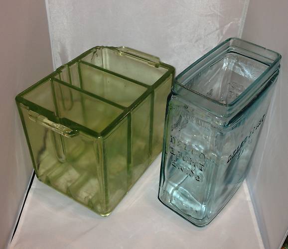 Found 2 nice Battery Jars from antique stores on my way to GCIC in Racine this weekend. The one on left has no manufacturing embossing at all and is depression glass green. It has a small tornado of bubbles in one corner that lead to a slice of glass missing on one of the corners. Other than that it is a great piece of glass. If anyone has any information on who manufactured these or how they were used, feel free to share. Many at the swap meet thought it was an automotive application. The other is a perfect Excide Jar in mint condition. |