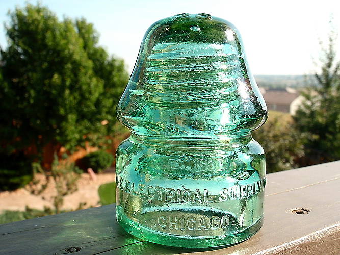 CD 133.1 25 / THE ELECTRICAL SUPPLY CO CHICAGO in a great green. Five scattered pencil lead point ticks, side upper wire ridge matchhead size potstone bruise and a side lower wire ridge pinky nail size potstone bruise are the only flaws. $ 110.00 includes shipping. |