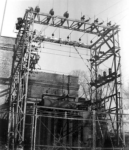 Located near Great Neck on the Port Washington line, the original 1914 building had its old rotaries removed and rectifier equipment put in as seen by the transformer. This happened before the 1950s. Photographed 1961.