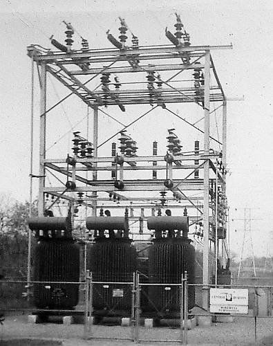 An old 69kv sub stepping down to either 4kv or 13kv. Not sure of the voltage-someone else took a picture of it. Replaced by a new sub stepping down to 13kv using 3-ph. transformer & metal enclosed switchgear for 13kv.. 1963 photo.