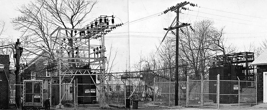 Center Moriches, NY. 23kv to 4kv sub was added to later to more than double the power. Newer transformer on right. Photographed 1960s.