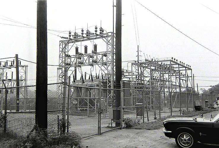 Originally supplied the 23kv line that went along the Long Island RR track to Speonk, the eastern end of PELCO's territory. North Bellport, originally Hagerman, was added to increase power on that line. When LILCO bought out PELCO in 1965, 13kv was added. Patchogue sub was originally a power plant put in the 1890s for Patchogue, hence it was on Electric St. Now replaced by an adjacent sub stepping down to 13kv in 1970 when this picture was taken (sub disconnected). |