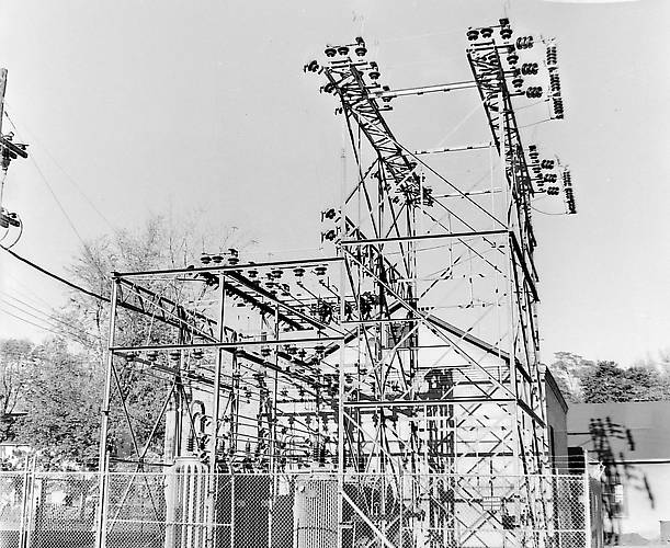 A fairly typical 23kv to 4kv sub with small single ph. transformers built in the 1920s. Taken down in the 1970s when 13kv replaced the 4kv distribution voltage. The 23kv lines were all taken out.