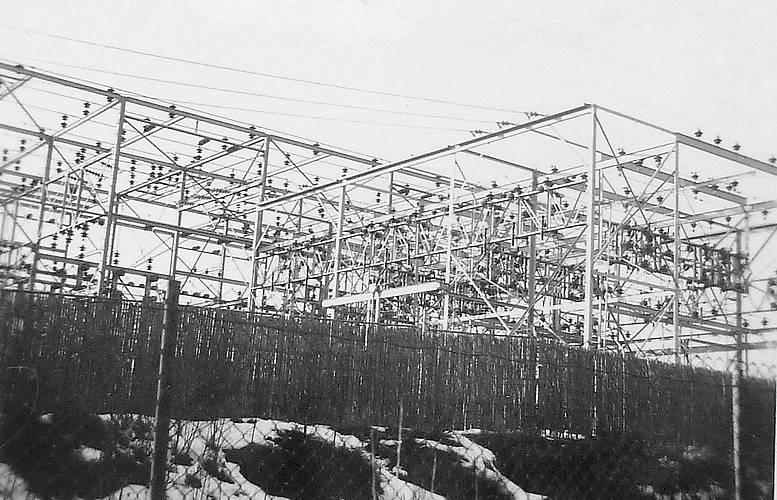 An old 69kv to 13kv sub that may have been put up in the 1940s. Note the open 13kv structure and the multi parts on the HV side. Now replaced by modern construction (easily convertible to 138kv) and metal enclosed switchgear for the 13kv. 1965 photo. |