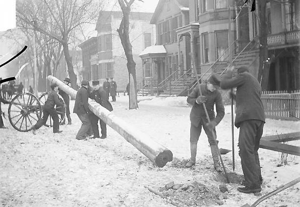 Chicago, 1902, Linemen Setting Pole in Snowstorm