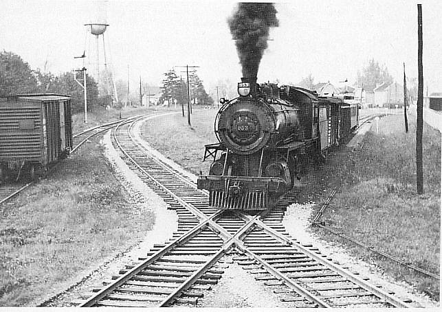 Canadian Pacific #953 on tracks originally built by the Credit Valley Railway in 1879, tracks on the left (then crossing to the right) are Canadian National originally built by the Great Western Railway 1870. J.William Hood July 9, 1955 http://www.trainweb.org/oldtimetrains/CPR_Bruce/BRANCHPSGR.htm |
