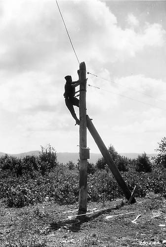 Photo of line worker on communications pole in the Monogahelia National Forest. Several years ago I saw a similar angled-arrangement still in service way up in Maine, owned by Verizon. It was a subscriber lead that led way up along an unpaved road. Without a lot of trees along the route, the line was in good condition. Replacement poles had new crossarms. Their metal pins were like the RR Western Union ones. Instead of wooden cobs, the their threaded sections were black plastic. H.K. Porter has made these since the 1990s at least. The insulators were re-used glass ones, mostly common clears. A retired Verizon employee told me he would not be surprised if the company has some unused clear insulators still in stock (and maybe within service vehicles along with related hardware) among used glass for rural open wire maintenance that they are still responsible for in sparse areas of northern New England. In some cases the subscriber is responsible for maintaining such lines but Verizon fixes it for whatever the fee. |