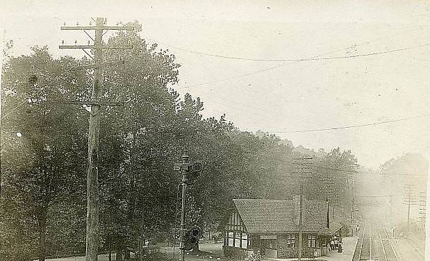 View of the railroad passenger station in this New York community with two main-line 6-pin (early) telegraph lines folllowing busy tracks Click "Previous" for a closeup view of this scene looking into the distance with telegraph poles on both sides of the tracks and for more information. |