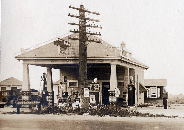 I'll bet you that this very well-overbuilt pole was fun for linemen to climb ;-) And if nothing prompted its demise since when this photo was taken, it probably is standing right now in sturdy condition serving some sort of utility purpose other than supporting openwire (of course). This pole stood in front of a cool-looking roadside gas station/variety store in this New York State community. The wires upon this pole either were for local subscriber or long distance (AT&T) circuits. |