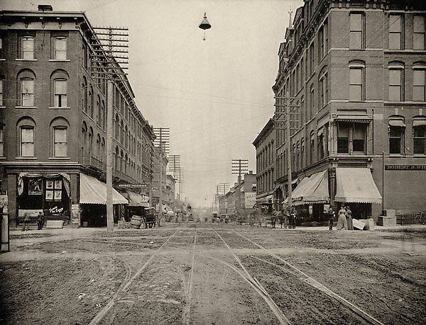 A telephone open wire line with 10 crossarms with ten insulators on each graced the left side of this main thorofare through Springfield just before the turn of the century (1900). An electric lighting service pole is also viewed on the right. An old spanwire arc street light suspended over the centre of this rather busy intersection. Severe ice storms around 1908 wreaked a lot of havoc throughout the state, bringing down plenty of trees and open wire lines. After that time a lot of rebuilding consisted of paired cable and placing utility routes underground, especially through downtown areas. Added note: Maybe a just a couple of the many hundreds of insulators within this image will appear at the Springfield, Ohio Insulator Show this weekend? |