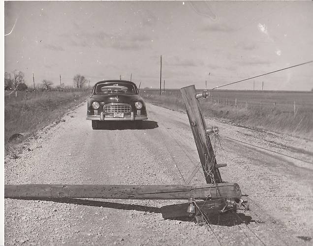 This is probably somewhere in Missouri. The openwire lines are scattered from a tornado (pronounced: torn a doo) that came through earlier. I believe that's Joe Maurath's 1968 Roadrunner (no?).